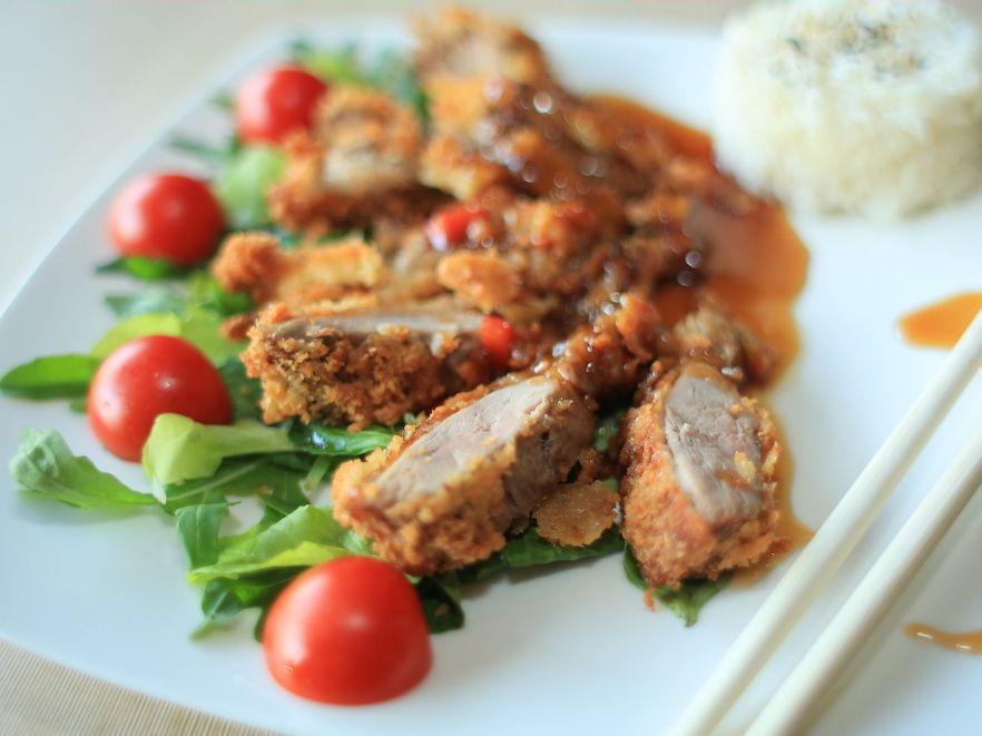 Pato crocante em molho de laranja, composição oriental de legumes frescos