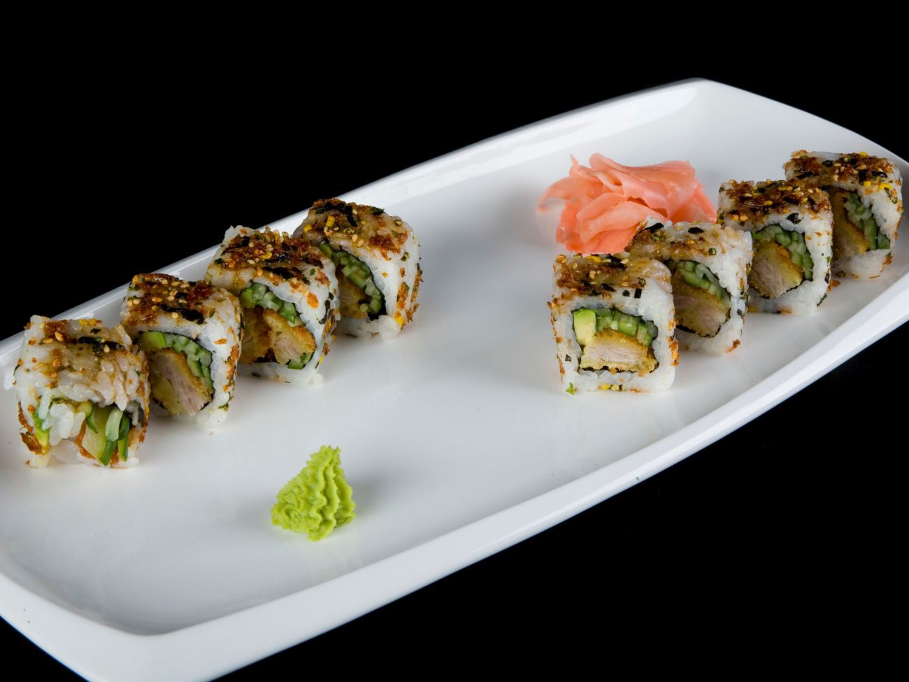 Sushi wieloskładnikowe - 8 sztuk. Składniki: kurczak w japońskiej panierce, awokado, ogórek, sezam